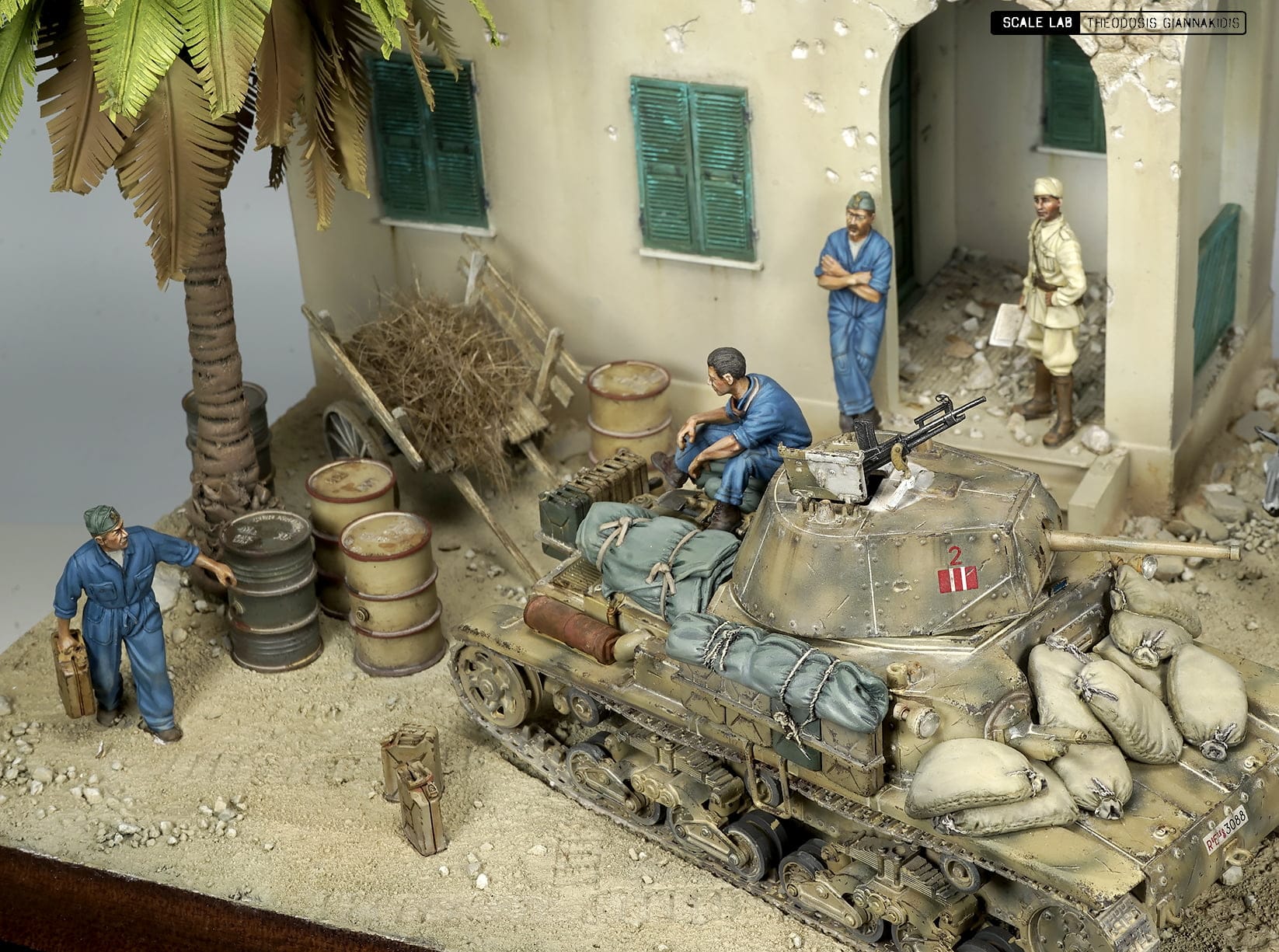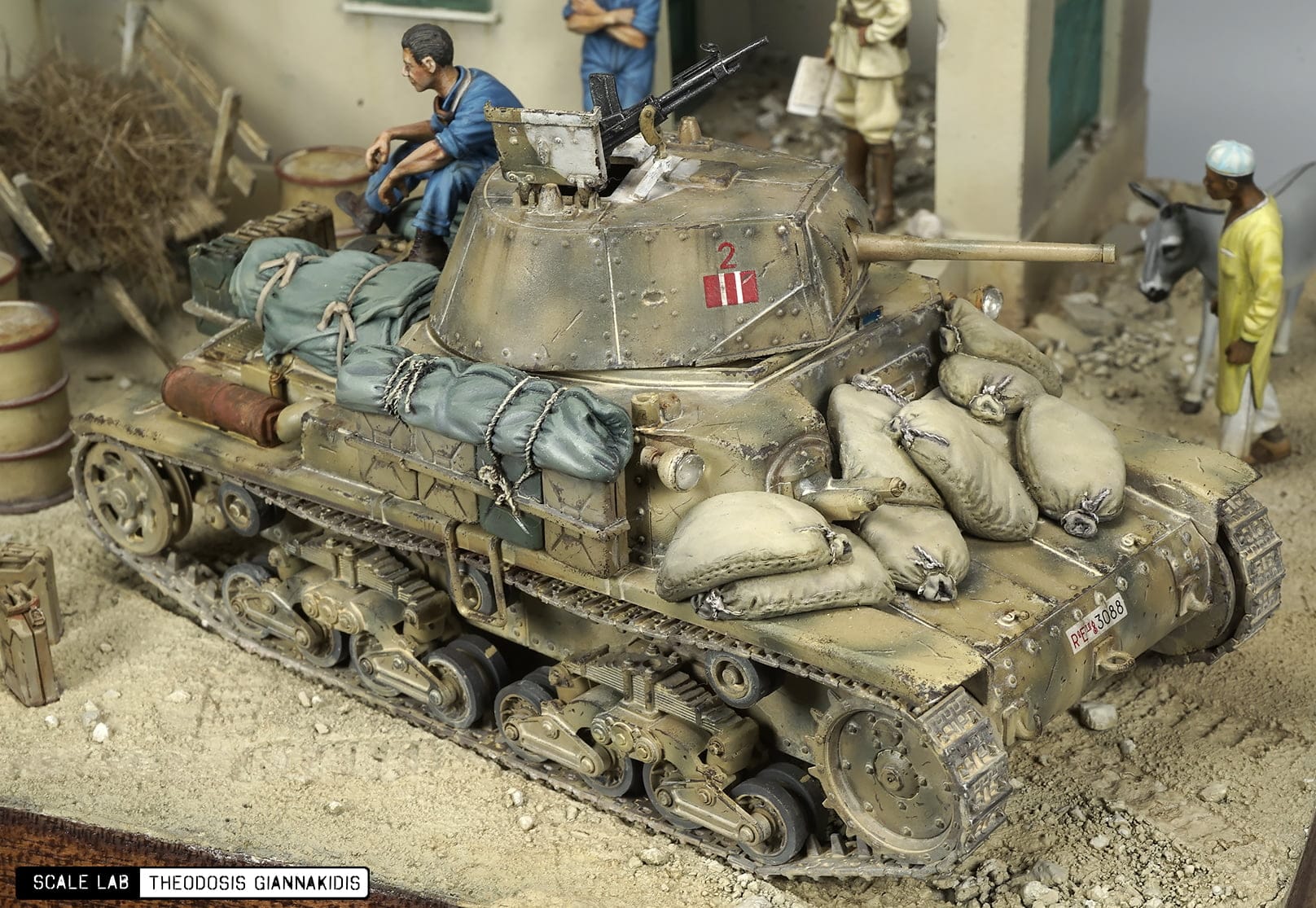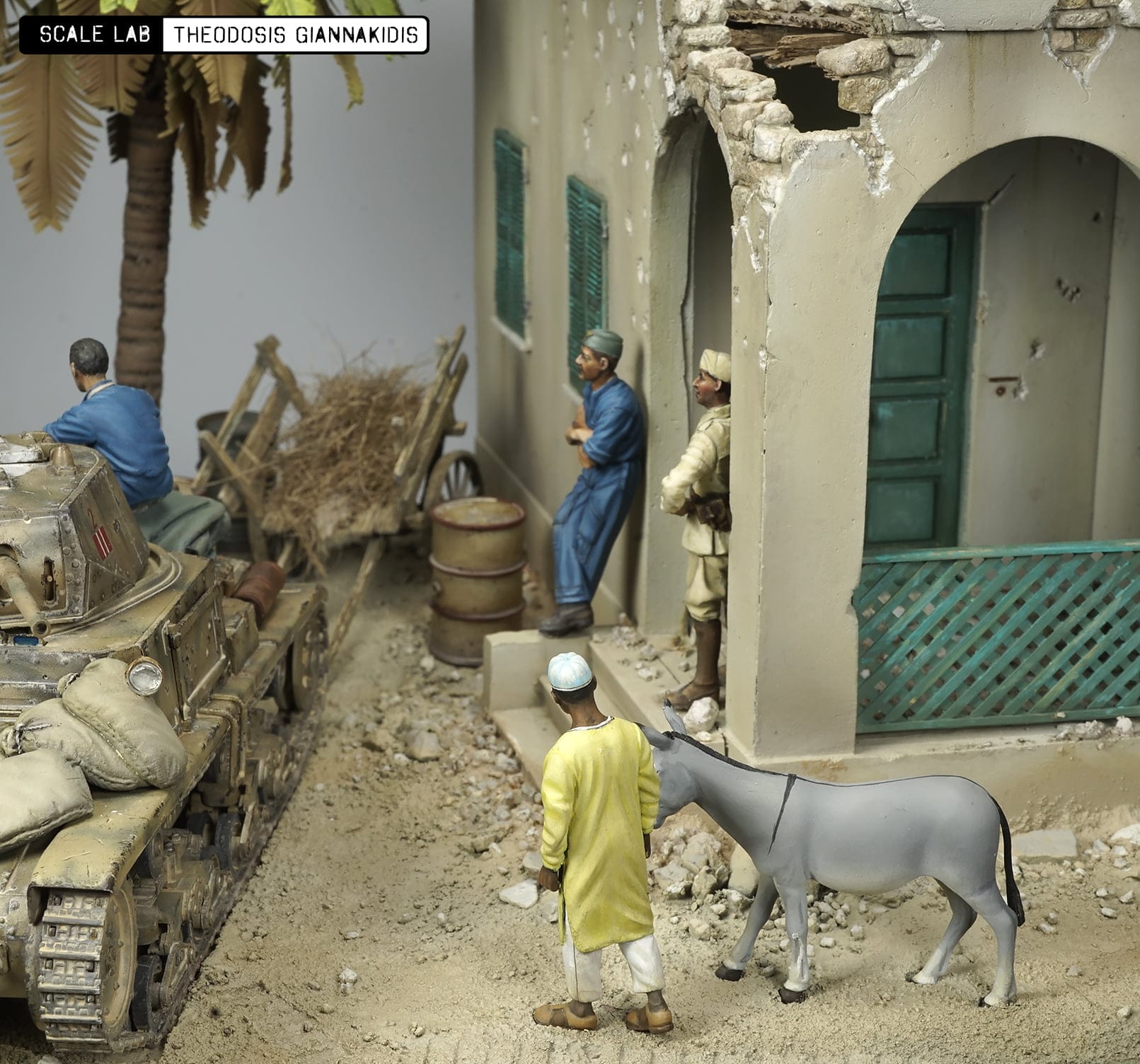 The model is from Tamiya a well detailed model comes with metal gun . The figures are resin from Model Victoria 4032 ITALIAN TANK CREW MAN AT REST, 40111 MAN WITH JERRY CAN and 4048 NORTH AFRICAN MAN WITH DONKEY the Italian officer t is from Tamiya . The building used is the Italian Colonian House from Model Victoria was painted with Lifecolor paints .