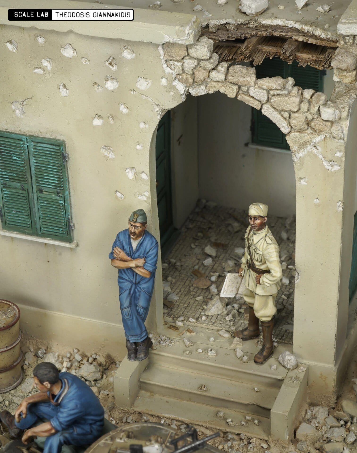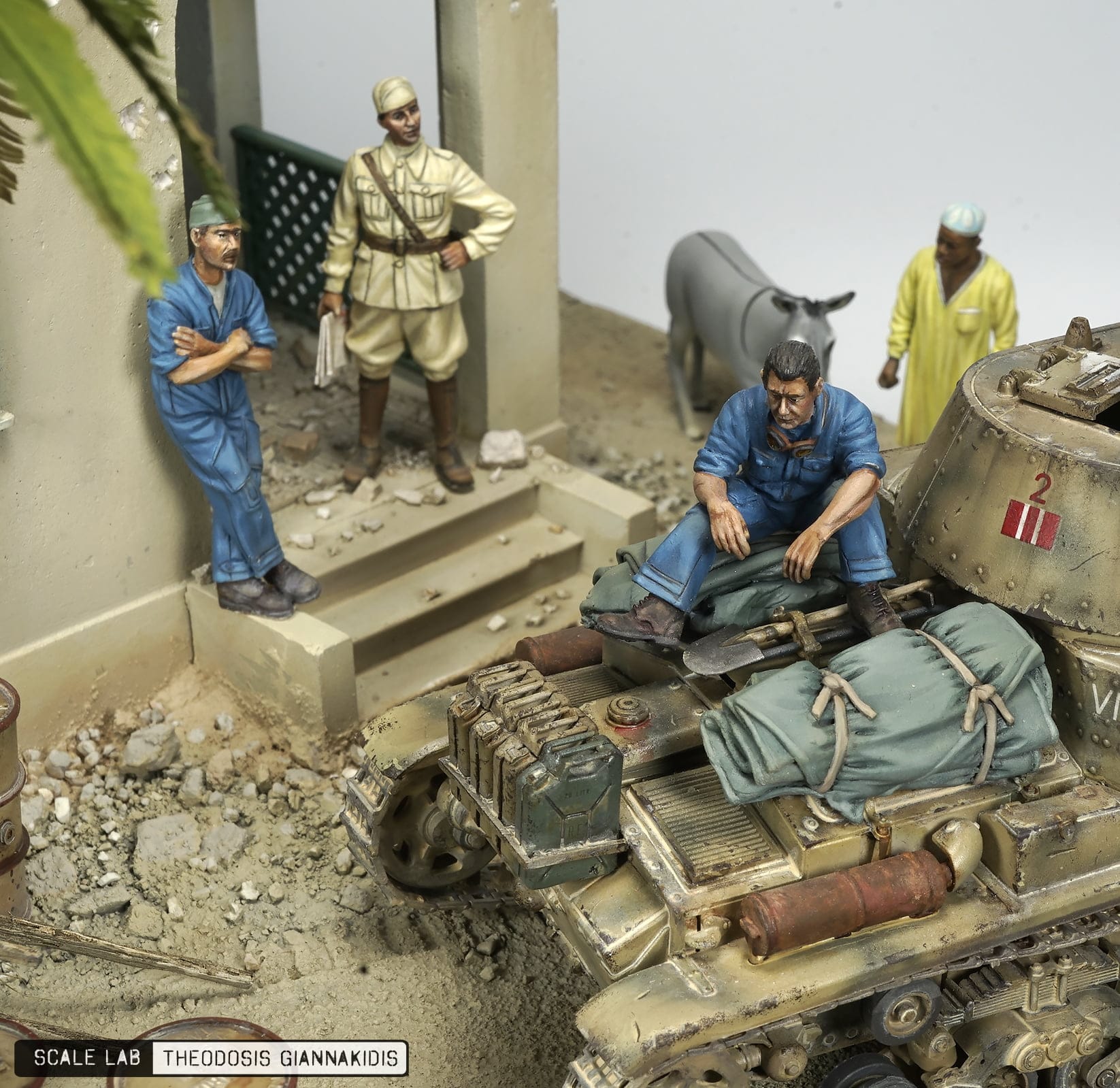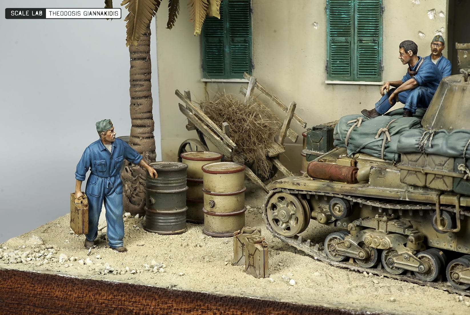 The model is from Tamiya a well detailed model comes with metal gun . The figures are resin from Model Victoria 4032 ITALIAN TANK CREW MAN AT REST, 40111 MAN WITH JERRY CAN and 4048 NORTH AFRICAN MAN WITH DONKEY the Italian officer t is from Tamiya . The building used is the Italian Colonian House from Model Victoria was painted with Lifecolor paints .